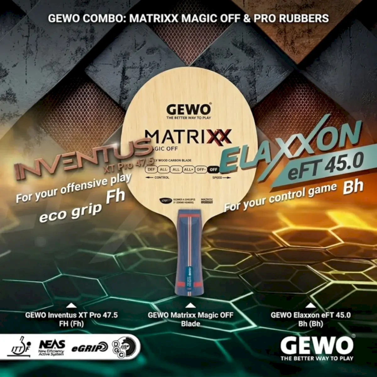 GEWO Matrixx Magic OFF Inventus 47.5 Elaxxon 45.0 modelinin kalbinde yer alan UD Karbon teknolojisi, karbon katmanların merkeze yakın yerleştirilmesi sayesinde vuruş anında ahşabın doğal dokunuşunu hissetmenizi sağlar. Forehand tarafındaki 47.5 orta sert süngerli Inventus ile Backhand tarafındaki 45.0 orta sertlikteki Elaxxon, GEWO Matrixx Magic OFF Inventus 47.5 Elaxxon 45.0 paketini masada hata payını azaltan bir yapıya kavuşturur. Bu "yüksek hassasiyetli" profesyonel raket olan GEWO Matrixx Magic OFF Inventus 47.5 Elaxxon 45.0, pasif bloklarda kontrolü elden bırakmazken aktif ataklarda rakibi zorlayan bir hız üretir.